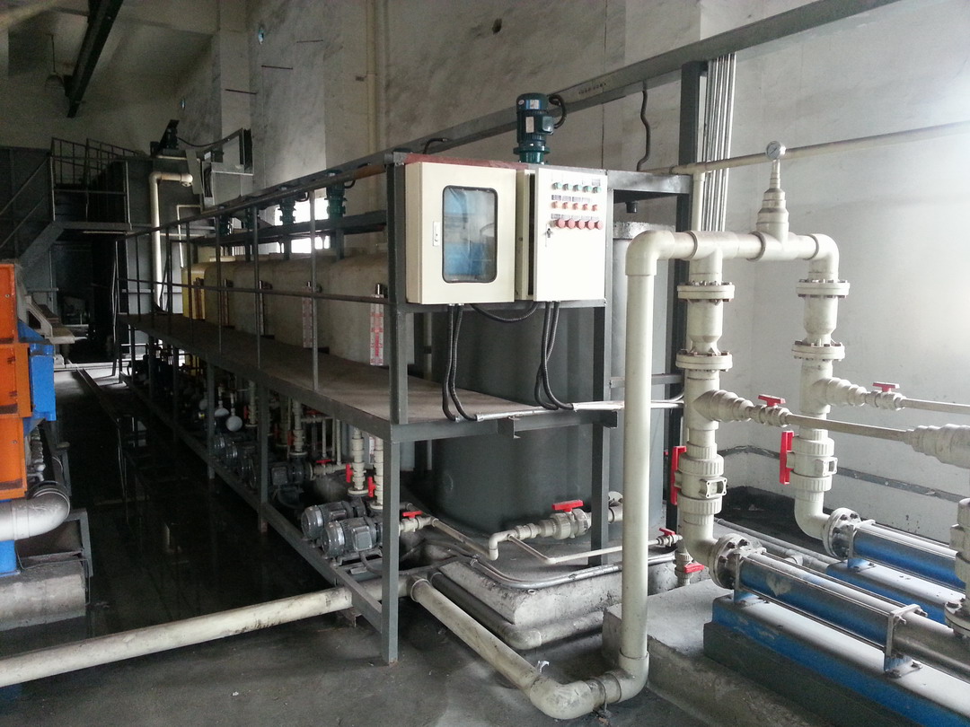 2、一级中和箱:废水经提升泵送至一级中和箱,中和箱中设置pH调节系统,通过控制阀及变频装置控制石灰乳的投加量,以维持废水在中和箱中的pH值(8.8~9.0),此时原废水中大量的重金属离子(如Zn2+、Mg2+等)均以氢氧化物的形式析出。
