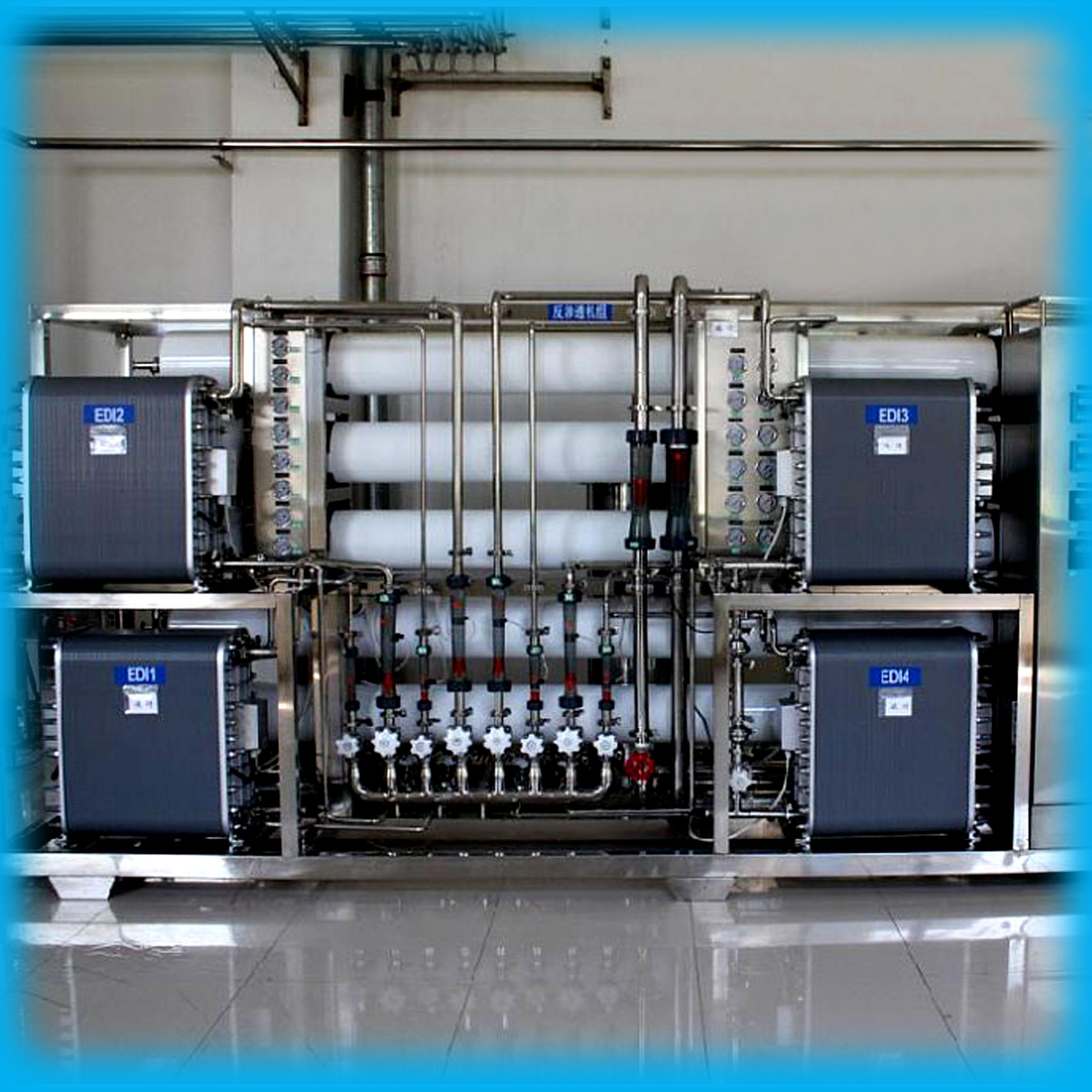 设备简介:6T/H RO双级反渗透纯水系统+6T/H EDI系统 。 行业用途:精密电子行业清洗用水 产水水质:大于17MΩ.cm 设备流程:原水→多介质过滤器→活性炭过滤器→精密过滤器→中间水箱→一级反渗透设备→二级反渗透设备→ 纯水储水箱 →纯水增压泵→EDI系统→超纯水箱→超纯水泵→后置保安过滤器→用水点